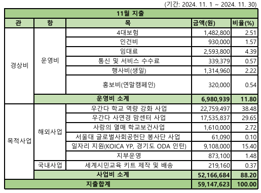그 동안 호이는 살림 규모에 비해 KOICA 사업비 이월금의 비율이 커서 실제 월 수입과 지출, 현금 흐름을 정확하게 파악하기 어려웠습니다. 호이가 내년도 사업 미선정으로 향후 조직 축소가 예정되어 있어, 정확한 재무 상태 파악이 필요한 시점이라 재정보고 양식을 일부 수정하였습니다. 11월에는 호이 사무국에 큰 도움이 되고 있는 KOICA YP 2명, 경기도일자리재단의 ODA 인턴 2명의 일자리 지원금이 들어왔고, 2025년 1월에 예정된 서울대학교 글로벌사회공헌단 우간다 해외봉사단 개산급이 입금되었습니다. 또한 직원 퇴직금 등 향후 호이의 조직 축소에 필요한 자금을 마련하기 위해 연 4.98%(3개월 변동 금리)로 5,000만원을 대출받았습니다. 생일 파티는 보내주신 후원금 내에서 행사를 치를 수 있었고, 연필 캠페인은 12월에 시작인데 11월부터 기부금을 보내주셨습니다. 모두 감사합니다. 재정적으로 많이 어려운 시기를 지나고 있지만, 호이의 재정 구조를 개선하는 기회로 삼을 수 있도록 노력하겠습니다. 감사합니다.